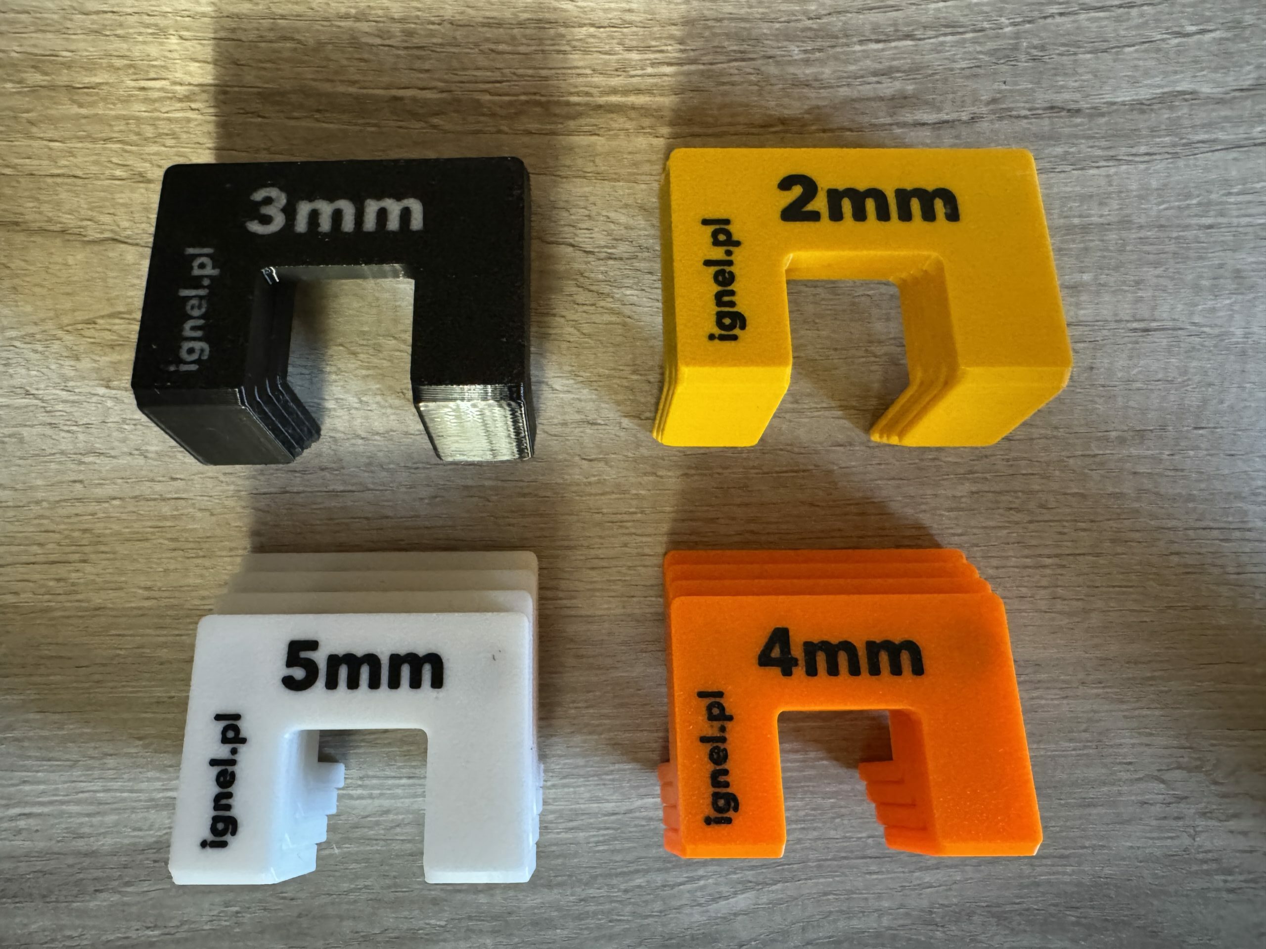 Każda grubość posiada inny kolor, co pozwala szybko rozpoznać właściwy dystans i ogranicza ryzyko pomyłki podczas montażu.